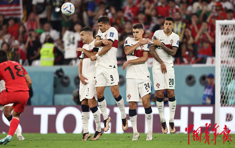 12月2日,在卡塔尔赖扬教育城球场进行的2022卡塔尔世界杯足球赛H组比赛中,葡萄牙队在比赛中安排人墙防守任意球。刘占崑/摄