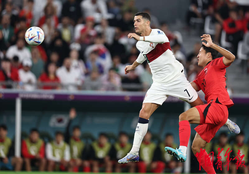 12月2日,在卡塔尔赖扬教育城球场进行的2022卡塔尔世界杯足球赛H组比赛中,葡萄牙队球员C罗(克·罗纳尔多,下同)与韩国队球员拼抢。刘占崑/摄