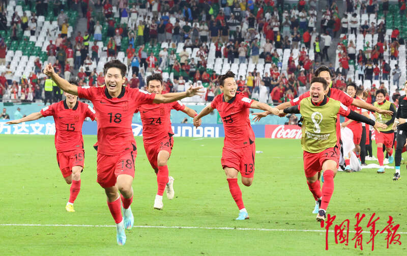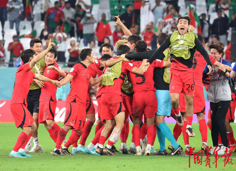 12月2日,在卡塔尔赖扬教育城球场进行的2022卡塔尔世界杯足球赛H组比赛后,韩国队庆祝胜利。刘占崑/摄