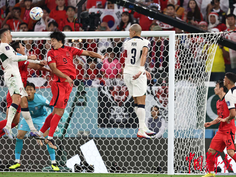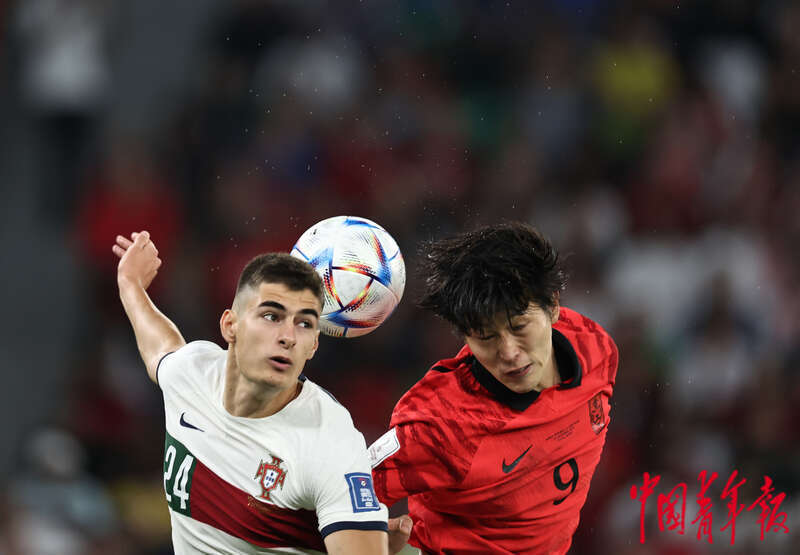 12月2日,在卡塔尔赖扬教育城球场进行的2022卡塔尔世界杯足球赛H组比赛中,葡萄牙队与韩国队球员争夺头球。刘占崑/摄