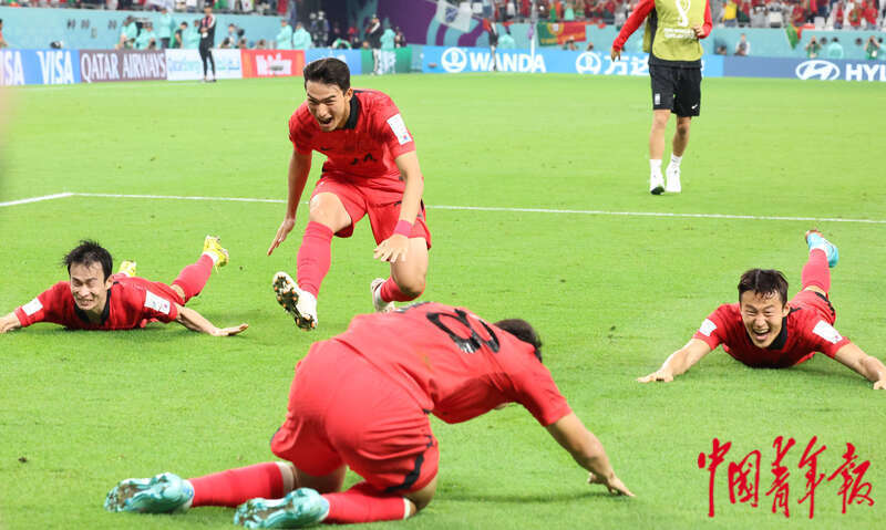 12月2日,在卡塔尔赖扬教育城球场进行的2022卡塔尔世界杯足球赛H组比赛中,韩国队以2比1战胜葡萄牙队,韩国队球员高举国旗庆祝胜利。目前,卡塔尔世界杯小组赛结束,十六强全部产生。葡萄牙队排名小组第一晋级,韩国队则因为本场胜利跃至小组第二,成为继澳大利亚、日本之后第3支闯入16强的亚洲球队。刘占崑/摄