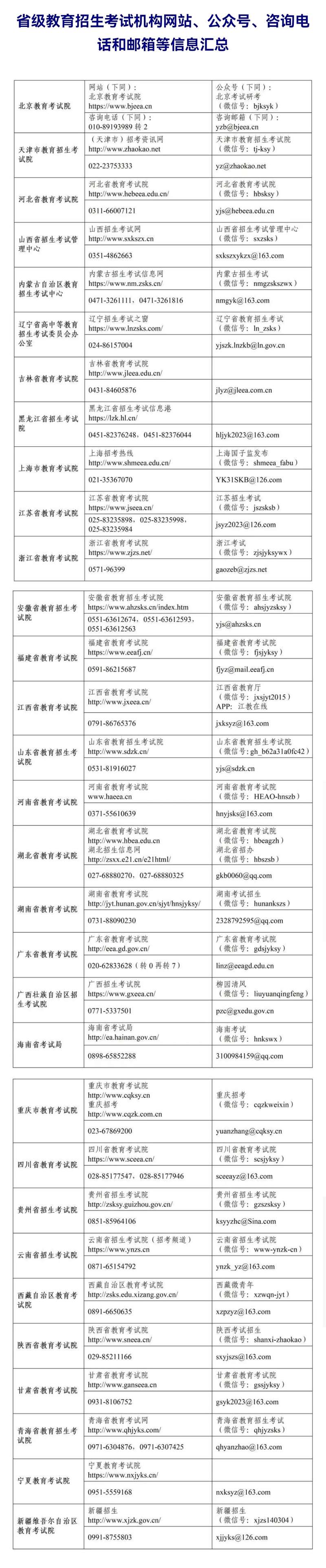 教育部指出,现将各省(区、市)教育招生考试机构网站、公众号和咨询方式公布如下,请考生密切关注报考点所在地省级教育招生考试机构发布的信息,做好考前准备和安排,如有疑问,可通过电话、邮箱等方式进行咨询。