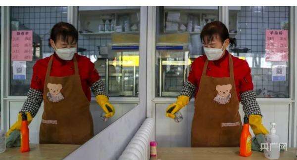 一名店员正在消毒,为开业做准备(央广网记者 贾海元 摄)