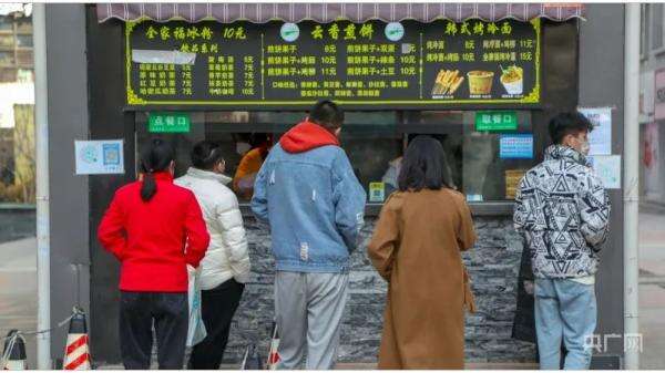 一家餐饮店门口排队采购的市民(央广网记者 贾海元 摄)