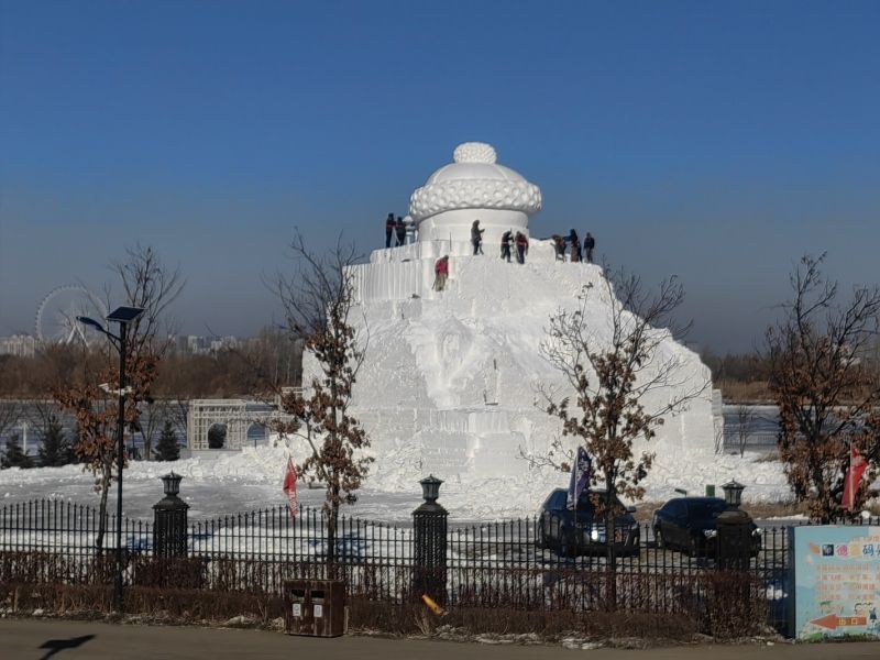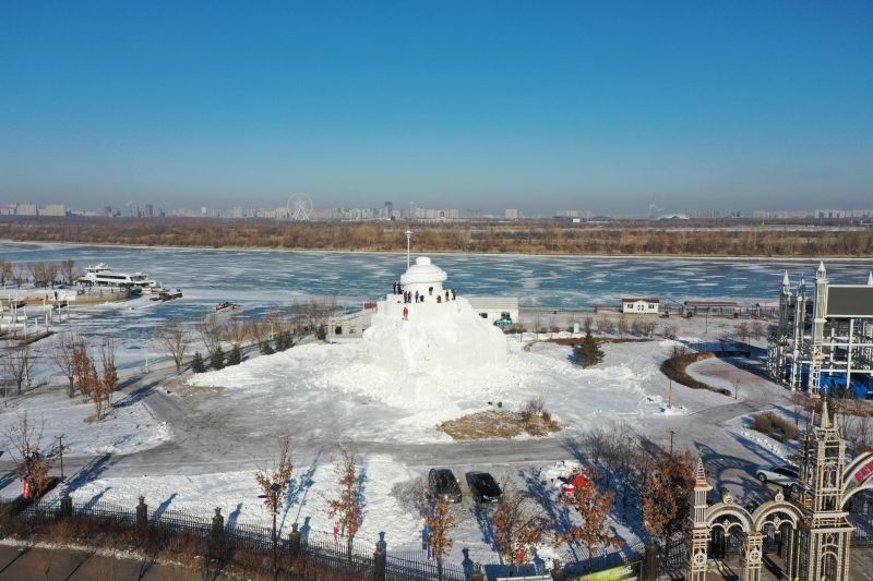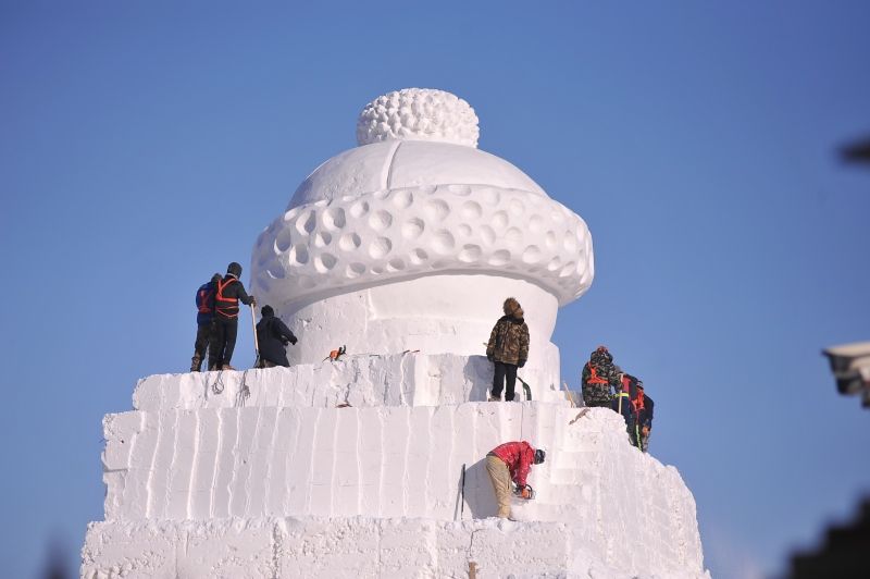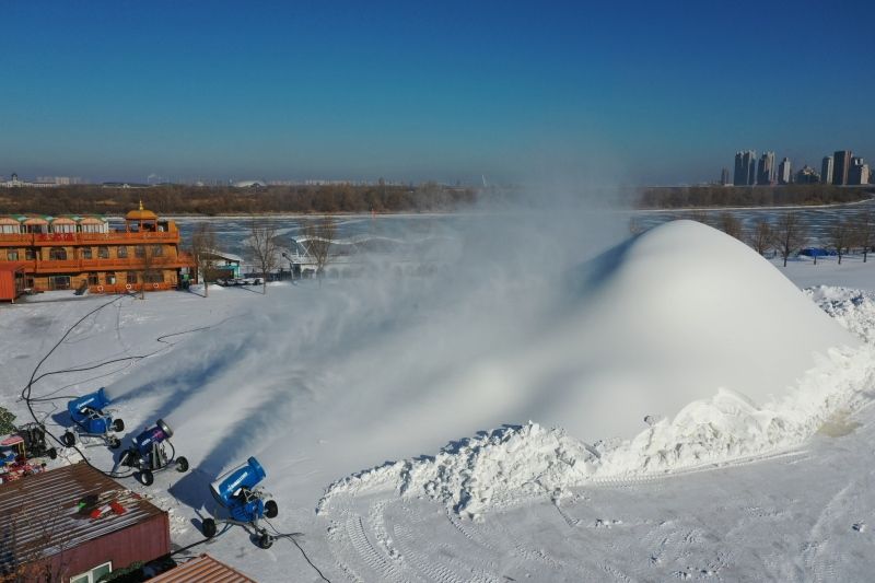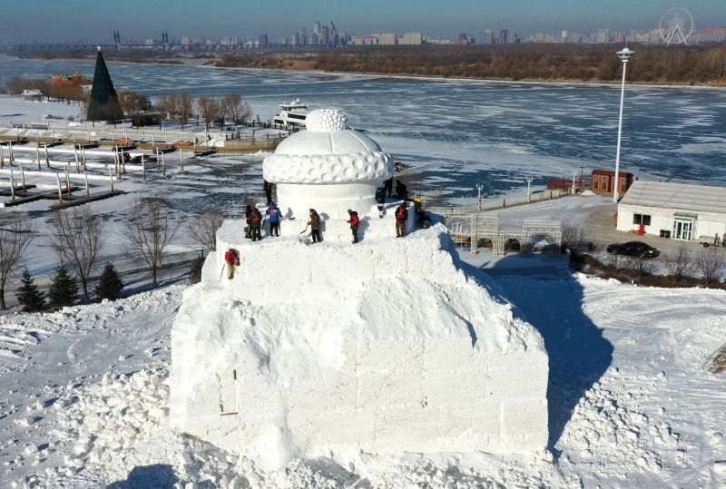 2022年12月5日,哈尔滨市,道里区群力江畔,一座近20米高的大型雪雕正在制作之中;三台人工造雪机不停地运转,造出的雪堆成了小山。