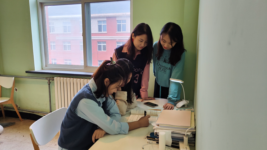 大一入学伊始,刘欣妮、朴舒芃、侯灵杰、张一涵四人就明确了自己的目标,争取保研资格。平日里,她们一起抢课堂的前排、一起做实验、一起参加大赛。对于朴舒芃、侯灵杰而言,英语是她们学习上的“拦路虎”,为了克服这一难关,她们便结伴学习相互督促,清晨背单词,增加词汇量,轮流抽查对方的掌握程度;练习口语,模拟对话,增强语感。大二时,她们偶然从优秀寝室的推送介绍中了解到“白板学习法”,于是她们也在宿舍里准备了白板,写上各科公式,每个人负责不同科目,互相讲题,学习成果显著,收获颇丰。朴舒芃说:“一开始抱着试试看的想法,没想到真的会取得进步。”