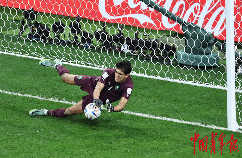 当地时间12月6日,卡塔尔教育城球场,在2022卡塔尔世界杯1/8决赛摩洛哥对阵西班牙的比赛上,摩洛哥队守门员布努扑出点球。在点球大战中,布努扑出了西班牙队两粒点球。刘占崑/摄