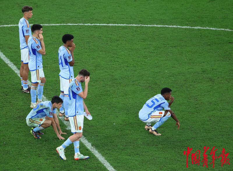 当地时间12月6日,卡塔尔教育城球场,在2022卡塔尔世界杯1/8决赛摩洛哥对阵西班牙的比赛上,点球大战中西班牙连丢3球负于摩洛哥,队员难掩失落。刘占崑/摄