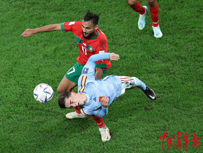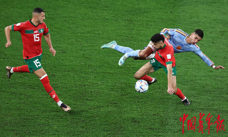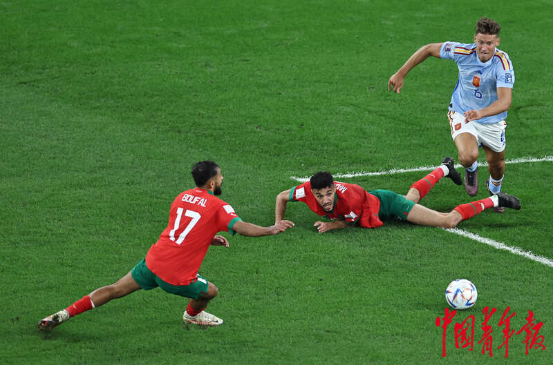 当地时间12月6日,卡塔尔教育城球场,在2022卡塔尔世界杯1/8决赛摩洛哥对阵西班牙的比赛上,双方球员争球。刘占崑/摄