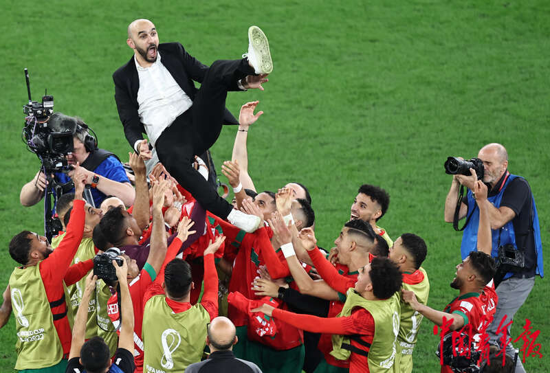 当地时间12月6日,卡塔尔教育城球场,在2022卡塔尔世界杯1/8决赛摩洛哥对阵西班牙的比赛上,摩洛哥队点球大战胜利后,队员们将教练雷格拉吉高高抛起。刘占崑/摄