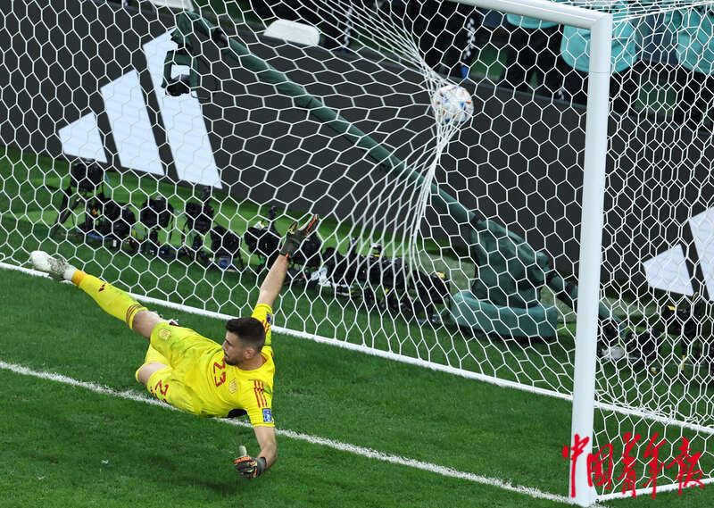 当地时间12月6日,卡塔尔教育城球场,在2022卡塔尔世界杯1/8决赛摩洛哥对阵西班牙的比赛上,摩洛哥队点球进网瞬间。刘占崑/摄