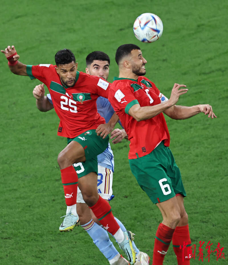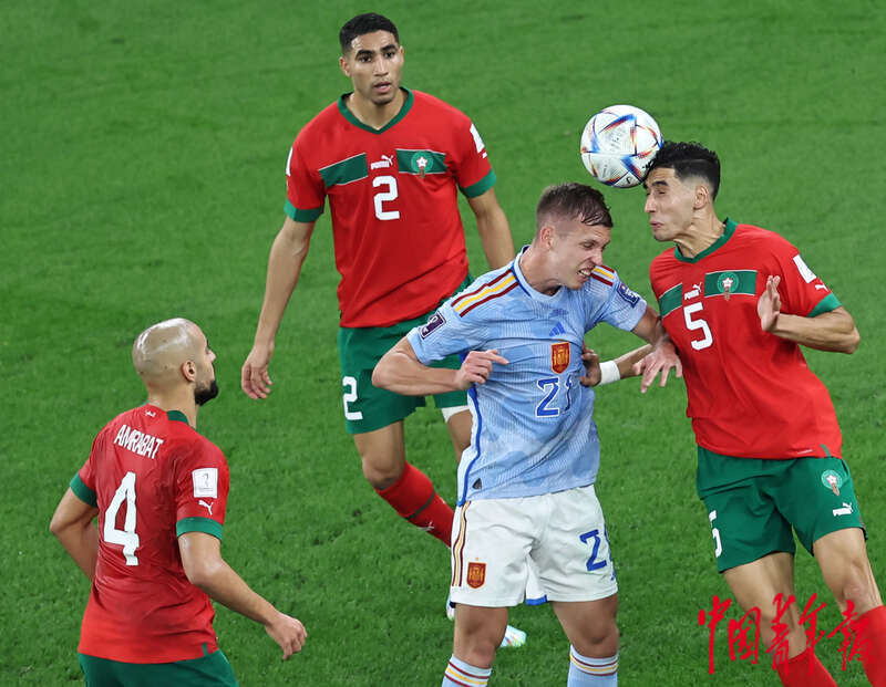 当地时间12月6日,卡塔尔教育城球场,在2022卡塔尔世界杯1/8决赛摩洛哥对阵西班牙的比赛上,双方球员头球争顶。刘占崑/摄