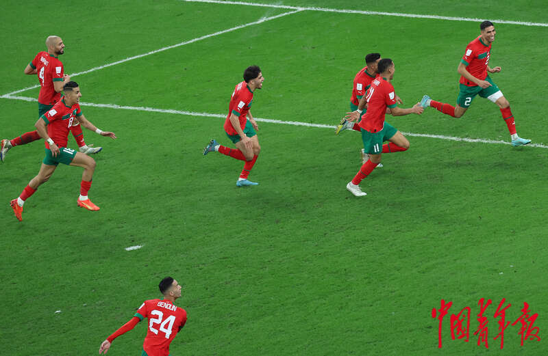 当地时间12月6日,卡塔尔教育城球场,在2022卡塔尔世界杯1/8决赛摩洛哥对阵西班牙的比赛上,摩洛哥队庆祝点球领先。刘占崑/摄