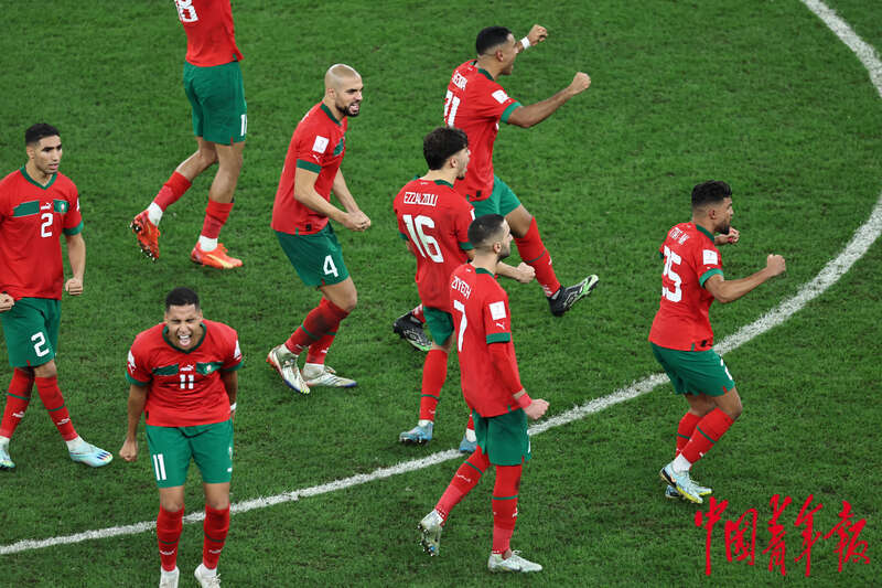 当地时间12月6日,卡塔尔教育城球场,在2022卡塔尔世界杯1/8决赛摩洛哥对阵西班牙的比赛上,摩洛哥队赢得点球大战后庆祝比赛胜利。当日,摩洛哥队与西班牙队在120分钟内均未进球,比赛被拖入点球大战,最终摩洛哥队以3:0战胜西班牙队,闯入8强。“非洲黑马”摩洛哥创造了队史最佳战绩,他们将在12月10日的1/4决赛中迎战葡萄牙队。刘占崑/摄