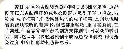 《卿卿日常》被称为能下饭的“电子榨菜”,但这份榨菜改变了古装剧的写法,不光是现代人视角的轻喜剧创作比较独特,这部剧还用四分之一的篇幅解决了主线,不再注重刻画男女主角形象,用散装副线剧情支撑后续故事,这些其实都是解构了电视剧创作的普遍规律。嬉笑怒骂的外壳下,其实是追求“轻爽”、迎合焦虑的创作追求。