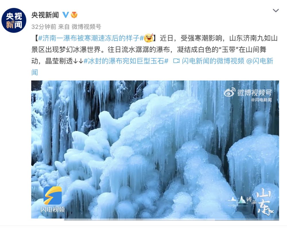 宛如巨型玉石!济南一瀑布速冻后变冰瀑世界