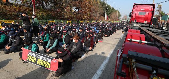 这引发了货物连带的强烈不满。11月24日,“货物连带”封锁了港湾、石油化学园区、炼油工厂等主要物流据点,开始了总罢工。货运连带委员长李凤柱表示:“在弱肉强食的市场中,货主企业拥有有关运费的所有决定权,并且决定了运费的最低单价。在这种形势下,安全运费制是保护货运劳动者权益的唯一法律制度。除非(政府)立即停止破坏安全运费制的企图、废除限时制、贯彻施行扩大适用车型与范围的要求案,否则,绝对不会放下总罢工的旗帜。”