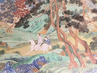 文徵明的学生仇英可没有唐寅那么多的忧愁,他本是平民出身,从未有科举中第的人生规划。他从漆工做起,凭借出色的绘画天赋,跻身于“吴门四家”的行列。《浔阳送别图》以唐代白居易《琵琶行》为主题,描绘了诗中“主人下马客在船”“琵琶声停欲语迟”等场景。这一题材在吴门画派的画家中颇为流行,所不同的是,仇英以浓重的色彩极尽铺陈渲染之势,尤其是在起首和中部以青绿重彩写山峦林木,有唐代李昭道的遗意。