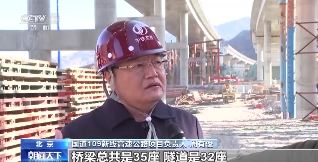国道109新线高速公路项目负责人 周有俊:目前工程进度是这样的,桥梁总共是35座,隧道是32座,桥梁已经完成了87%,隧道工程完成了76%。整个项目建设期是4年,2023年底正式交付使用,建成通车。