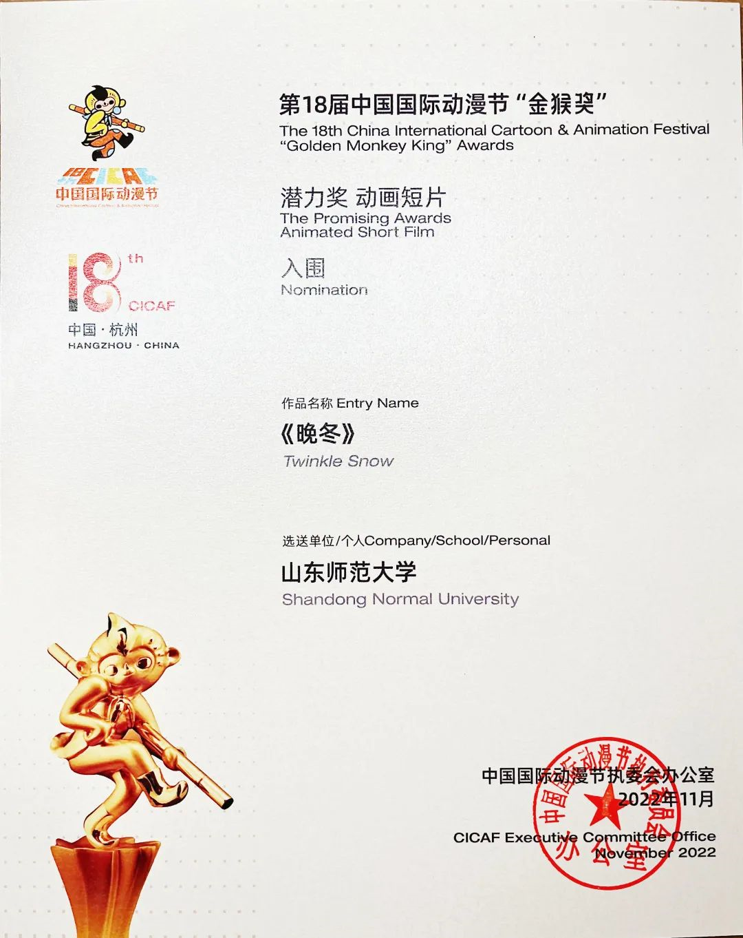据悉,第18届中国国际动漫节收获了来自世界各地的高质量投稿,在来自19个国家和地区的近千部动漫作品中,仅有91部作品入围“金猴奖”终评。我校新闻与传媒学院2019级数字媒体艺术专业的薛喆、邹怡豪与广播电视编导专业的岳悦共同创作的动画短片《晚冬》获得佳绩,成功入围第18届中国国际动漫节“金猴奖”动画短片潜力奖。