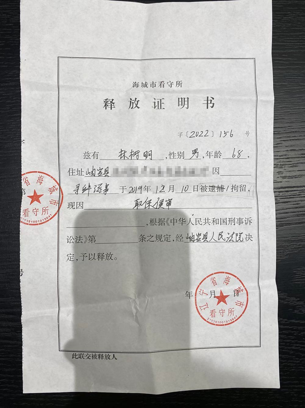 林树明于2019年12月9日被抓,已被羁押3年,等于原一审判决中他被判的刑期。海城市看守所作出的《释放证明》显示,因取保候审,岫岩县法院决定对林树明予以释放。