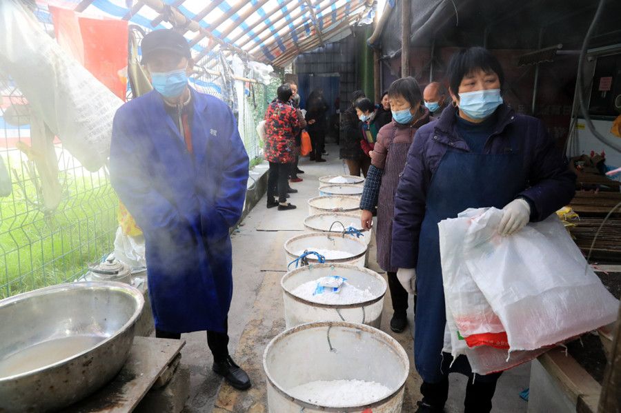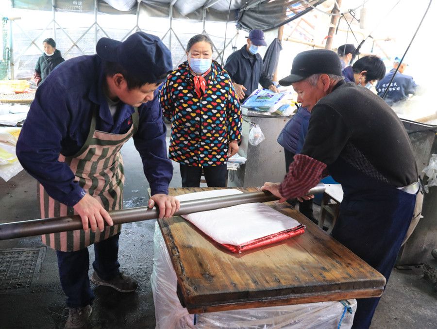 2022年12月12日,杭州市,萧山区新街街道沿江村传统年糕进入加工高峰期,年糕加工点内一片忙碌,师傅们忙着为村民和周边镇街的居民加工年糕。