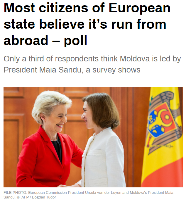 “今日俄罗斯”12月6日称,据摩尔多瓦民调机构IMAS研究所当天公布的最新民调显示,约有59%的受访者认为摩尔多瓦处于美国或欧盟军队的控制之下,只有32%的人认为国家是由马娅·桑杜总统领导的。当被问及总统在多大程度上参与了该国事务时,约39%的人表示她在任两年期间根本没有参与,而另有25%的人表示她没有适当关注摩尔多瓦的内政。