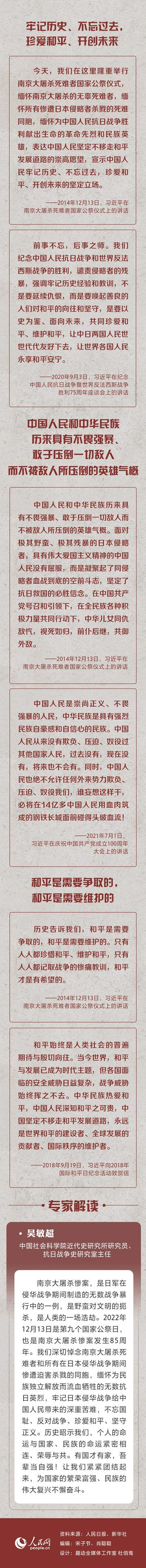 12月13日是南京大屠杀死难者国家公祭日,让我们重温习近平总书记关于“战争与和平”的论述,以尊崇之心珍视和平、以民族之力矢志复兴。