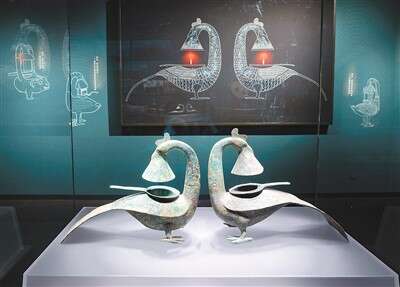在“广西古代文明陈列”展厅,羽纹铜凤灯背后墙面的屏幕上,两只铜凤灯被点着了,橘红色的火苗闪烁跳跃,眼前古老的文物似乎活了起来……