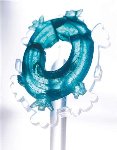 玻璃是汉代海路贸易的主要商品。广西博物馆是全国收藏汉代玻璃器数量最多的博物馆。展厅中的角轮形玻璃环吸引了不少人驻足欣赏。它呈青绿色,造型优美、独特,器身有6个花芽状装饰。从器形和玻璃成分来判断,这件玻璃环应该是来自越南南部的舶来品。专家认为其造型与两广地区常见的有角玉玦关系密切。有角玦饰传播到越南南部一带后,当地人结合自身文化特点,创制出更多复杂造型,饰品材质也更为丰富。