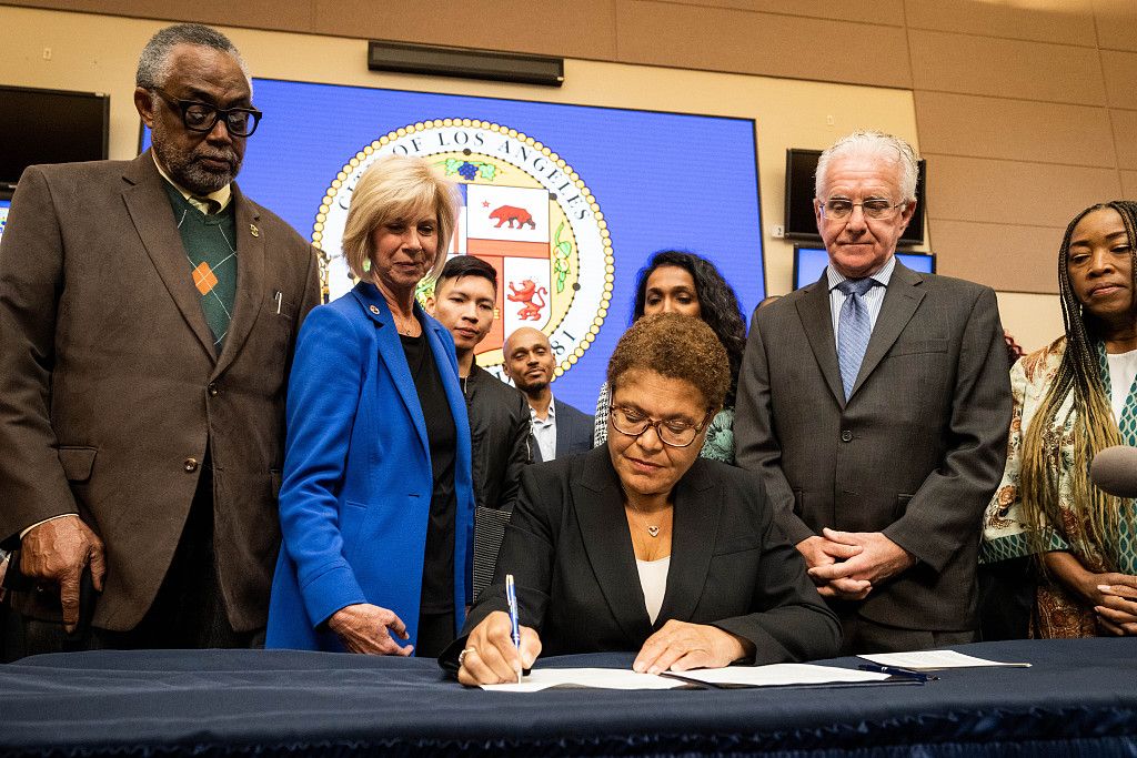 当地时间2022年12月12日,美国加州洛杉矶,洛杉矶市长凯伦·巴斯于12日在城市紧急行动中心签署了一份地方紧急状态声明,宣布洛杉矶市因无家可归者(问题)进入紧急状态,这是她上任后的第一项举措。视觉中国 图