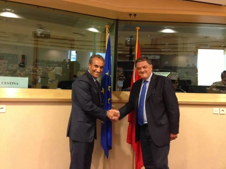 2013 年,摩洛哥驻波兰大使和潘泽利(右)在欧洲议会。 图源:《摩根报》