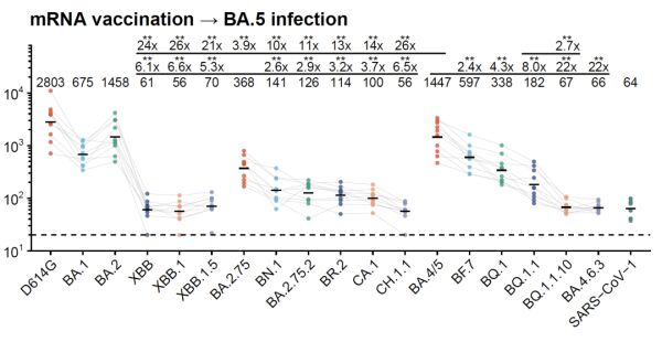 该团队还找了大量接种mRNA疫苗的患者血浆样本,其中有不少样本接种了两针灭活疫苗、两针mRNA疫苗再加上感染了BA.5,相当于五次免疫加强,但其康复一个月后的血浆对于最新突变株的中和抗体滴度仍然较低,可能再过两个月就无法防止再感染。这意味着,mRNA疫苗与灭活疫苗类似,在防止XBB和BQ.1.1突破感染方面的作用也十分有限。