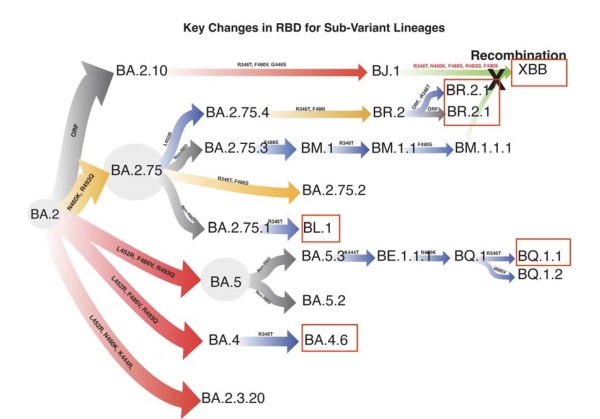 目前BQ.1和XBB是流行度最高的两个突变株家族。BQ.1来源于奥密克戎BA.5株,其子系BQ.1.1已经成为全球主要流行株。而作为两个奥密克戎BA.2后代突变株的重组体的XBB,有极强的免疫逃逸能力,在出现后短短两周内就在新加坡成为主要流行株,印度也基本被XBB所占据。二者在欧美广泛流行,上升趋势显著。