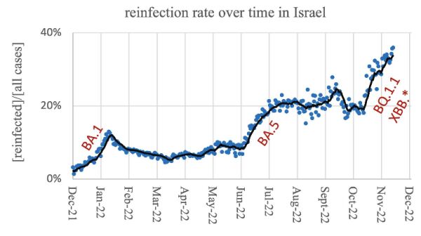 新毒株的出现是否会增加二次感染的可能,引起公众关注。北京大学生物医学前沿创新中心副研究员曹云龙致力于新冠病毒突变免疫逃逸机制研究。在近日的公开演讲中,他援引以色列的统计数据显示,近一年来,以色列新冠再感染率随着新的毒株流行而走高,近几周来,BQ.1.1和XBB(两个奥密克戎亚变体BJ.1和BA.2.75的组合)大流行下,再感染率从20%上升到35%并且仍在增长,而在BA.1和BA.5流行时期,再感染率高峰分别超过15%和20%。