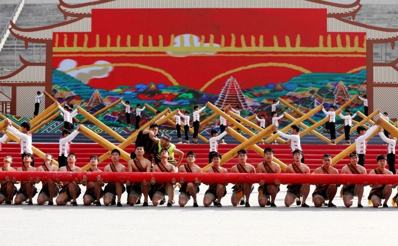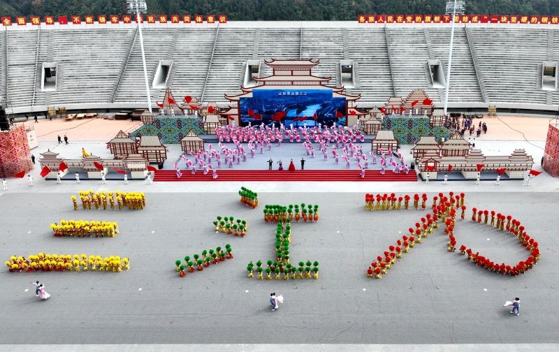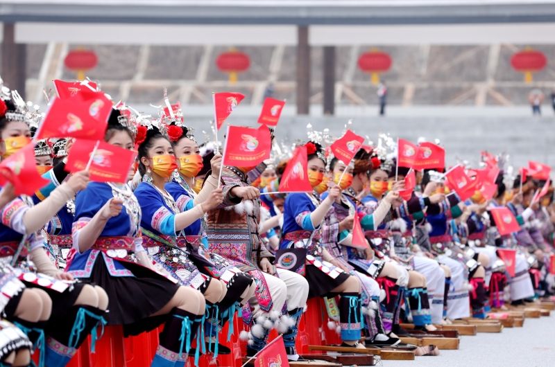 2022年12月15日,广西柳州,三江侗族自治县举行自治县成立70周年庆祝大会,当地各族同胞载歌载舞庆祝。