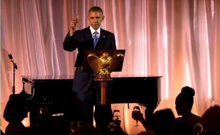 《纽约时报》网站截图:奥巴马在首届美非峰会期间的白宫晚宴上祝酒