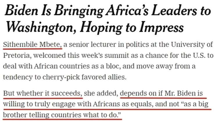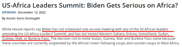 加拿大“地缘政治监测”网站以《美非峰会:拜登对非洲是认真的?》为题发文指出,白宫提供的信息显示,拜登没有安排与与会非洲领导人中任何一位进行双边会晤,也没有邀请西撒哈拉、厄立特里亚、索马里兰、苏丹、几内亚、马里和布基纳法索等国领导人与会。