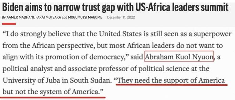 文章援引南苏丹朱巴大学政治学者亚伯拉罕·尼翁的话强调,“非洲仍把美国视为一个超级大国,但大多数非洲领导人并不想事事与美国保持一致”,“我们需要美国的支持,但不需要美国的制度”。