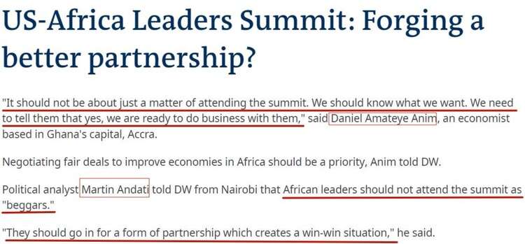 肯尼亚政治分析人士马丁·安达蒂也在采访中认为,非洲领导人不应该以“乞丐”身份出席非美峰会,而是“要建立一种能够创造双赢局面的伙伴关系”。