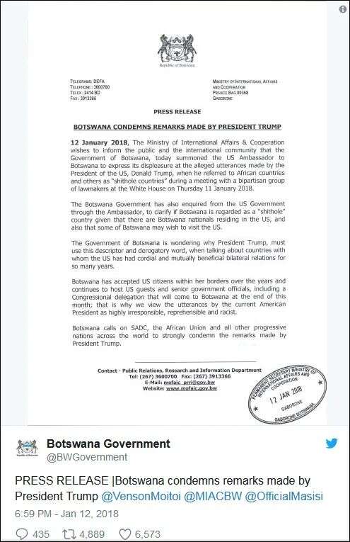 非洲国家博茨瓦纳政府批评特朗普的言论充满种族歧视,应该受到谴责。
