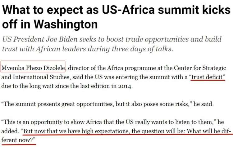 卡塔尔半岛电视台援引美国智库战略与国际研究中心(CSIS)非洲项目主任姆文巴·菲佐·迪佐莱的话质疑:美国是带着“信任赤字”进入本次峰会的,“这是一个向非洲国家表明美国真的愿意听取它们意见的机会……但问题是,现在会和以前有什么不同?”