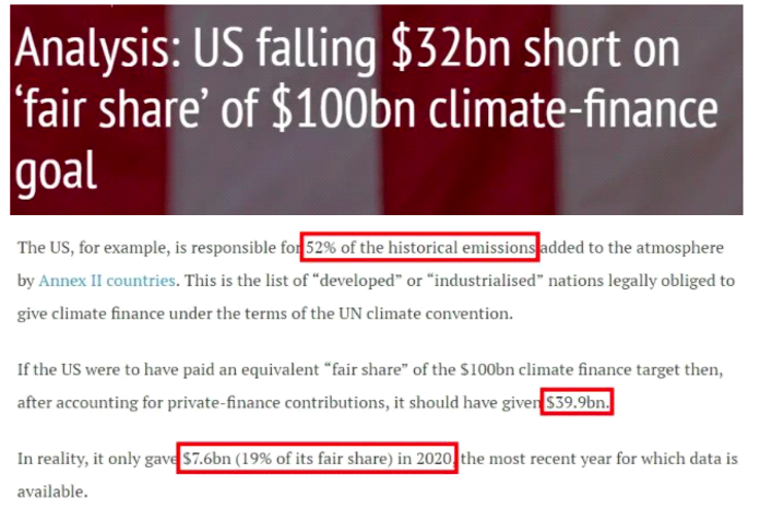 英国能源研究机构“碳简报”发布的数据表明,按照历史碳排放量份额计算,美国每年应提供399亿美元气候援助资金,但2020年只提供了76亿美元,仅占应分摊份额的19%,是23个相关发达国家中贡献最少的一个。