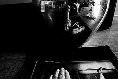 在灰色的背景墙下,翟永明的摄影——大部分是黑白——被打印成像大号明信片一般大小,一张张贴在墙上,间或装裱在由黑色卡纸衬托下的银色细边框里,像是一个个断句符号。这些摄影作品沿着墙面,挂在普通人心脏的高度,一路编排下去。观众边走边看,如同读一首错落的诗歌。