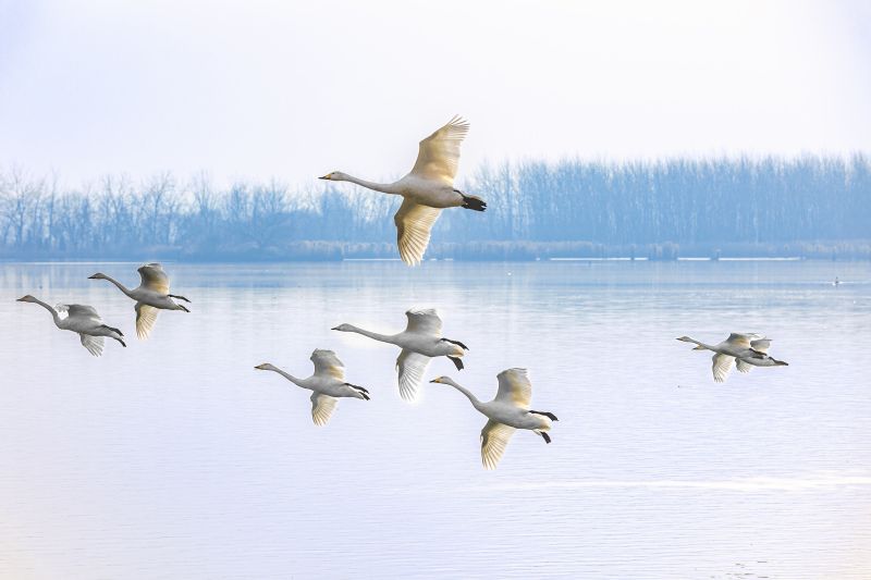 山西运城:圣天湖景区碧波荡漾 野生大天鹅湖面展翅高飞
