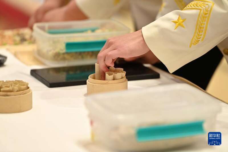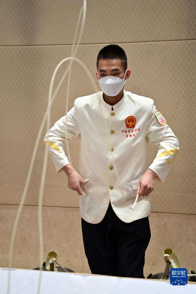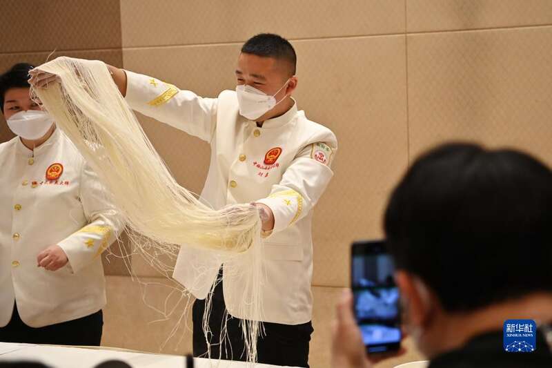 12月16日,厨师在2022中国非遗面食大会现场表演面食制作技艺。