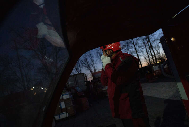 ↑夜幕降临,快递小哥齐帅龙佩戴头盔,准备从营业部出发送货(12月15日摄)。