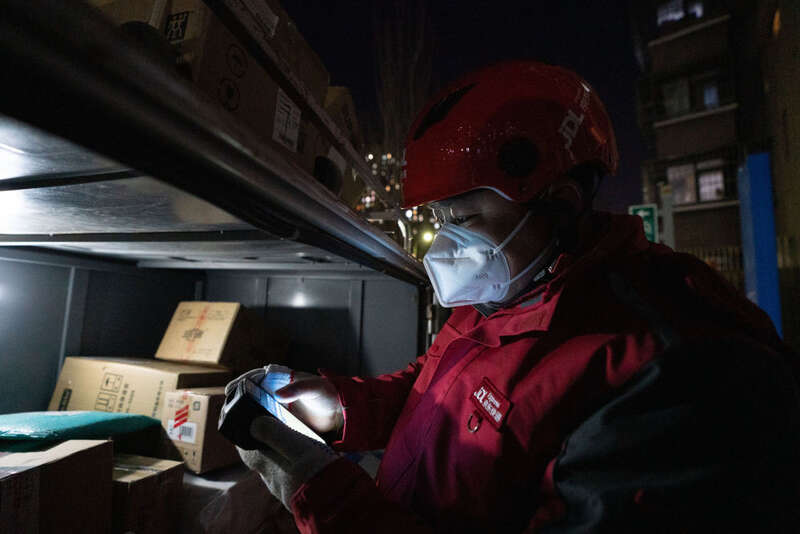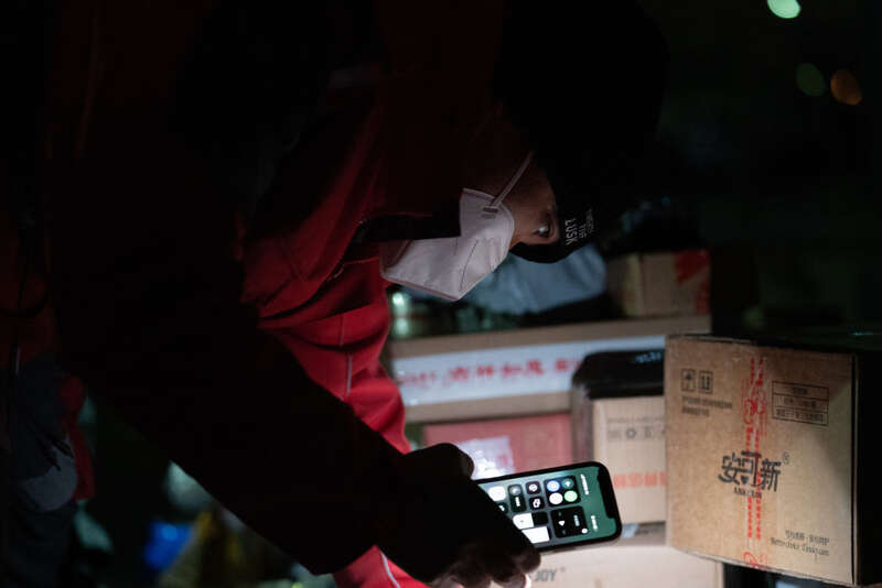 ↑在北京市大兴区新源时代小区,快递小哥高兴兴打开手机手电筒查看包裹信息(12月15日摄)。