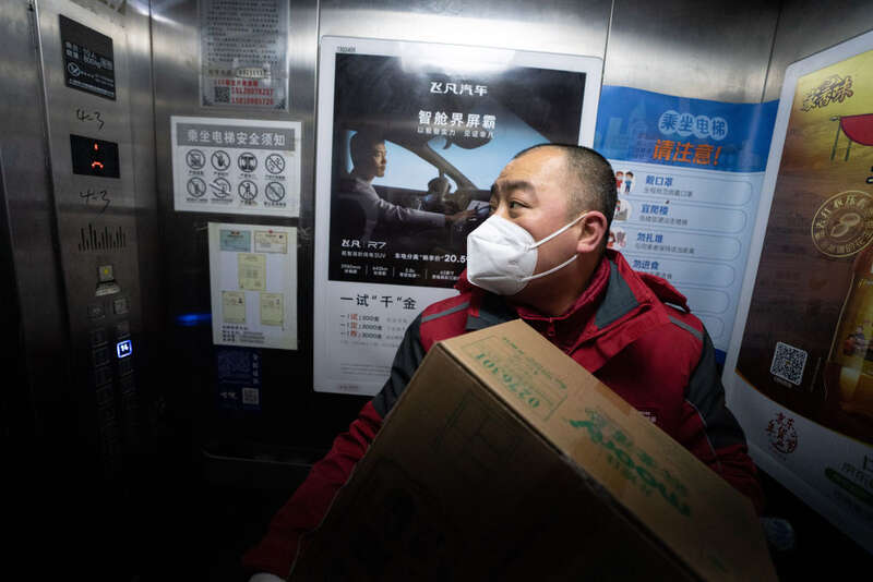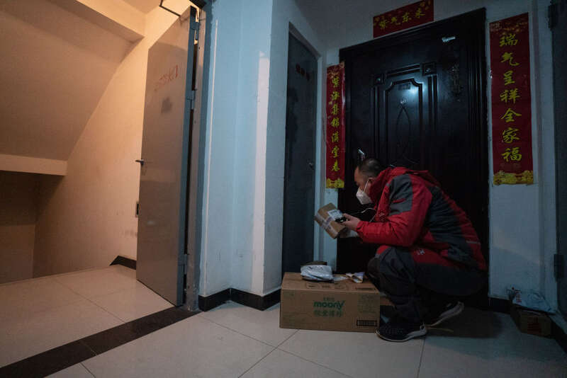 ↑在北京市大兴区新源时代小区,快递小哥齐帅龙在核查配送信息(12月15日摄)。