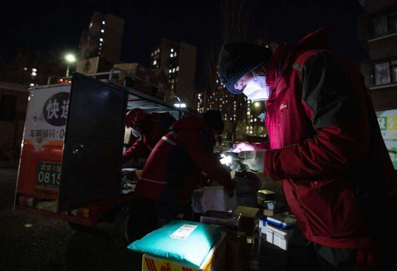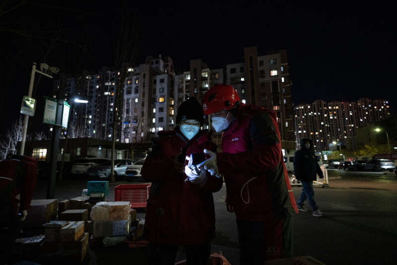 ↑在北京市大兴区新源时代小区,从西安赴京支援的快递小哥王选军(前)、齐帅龙(后左)和高兴兴按照楼号分货(12月15日摄)。